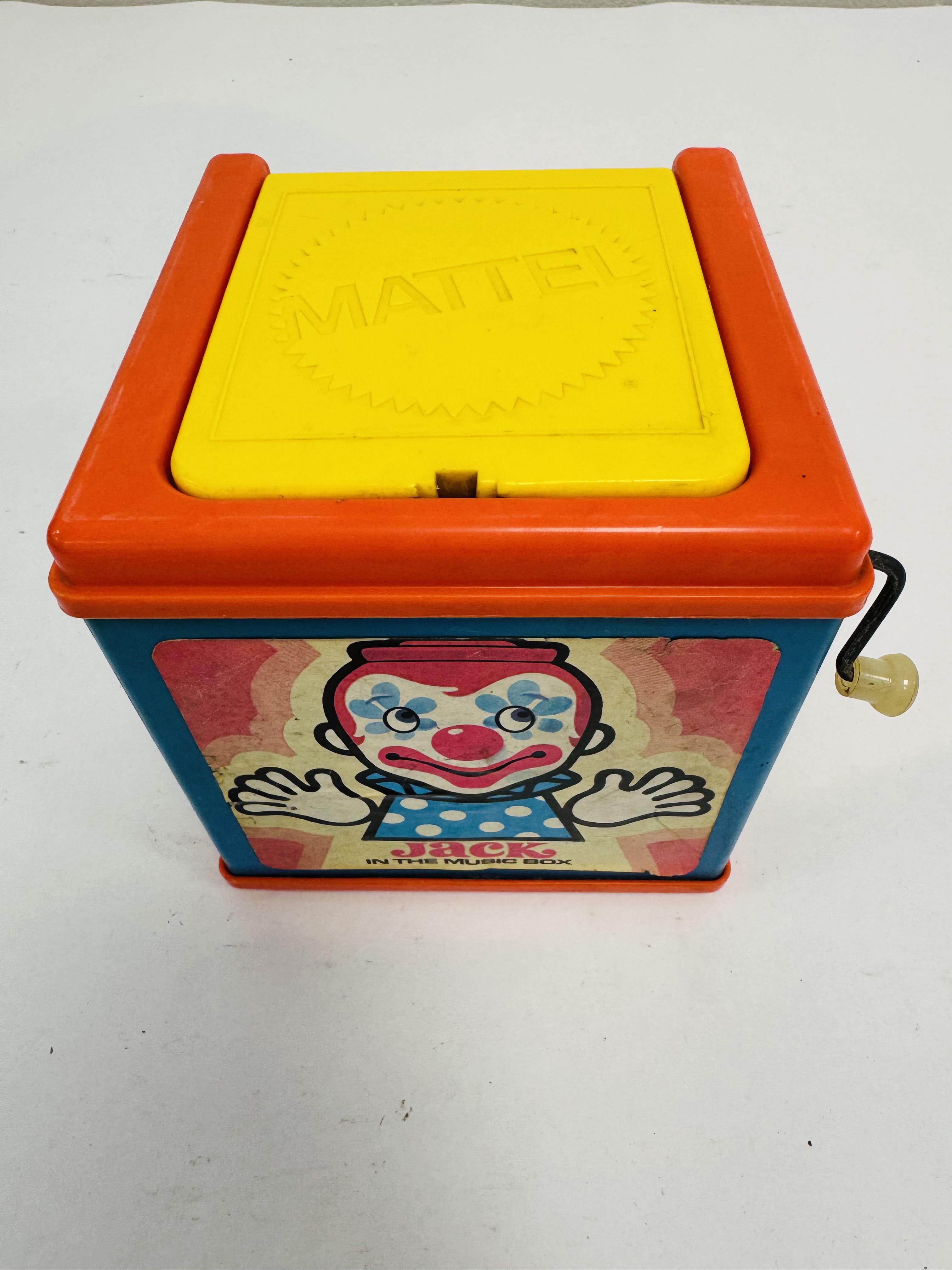 Lote #036 – Cubo Jack in the music box, Mattel 1976 con payaso que salta al girar la manivela – 30cm