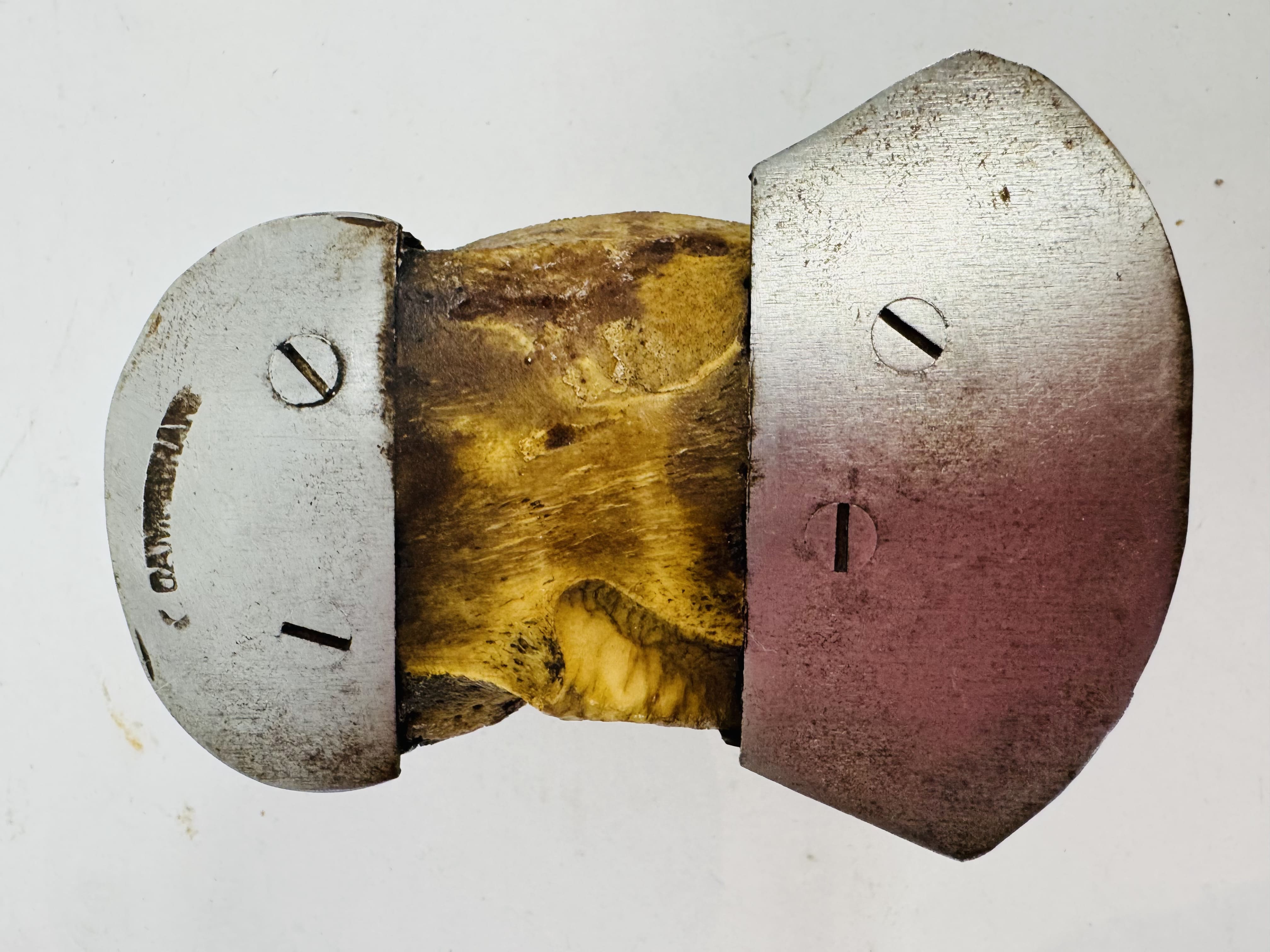 Lote #042 – Taba El Campechano con herraduras de bronce – 10x5cm