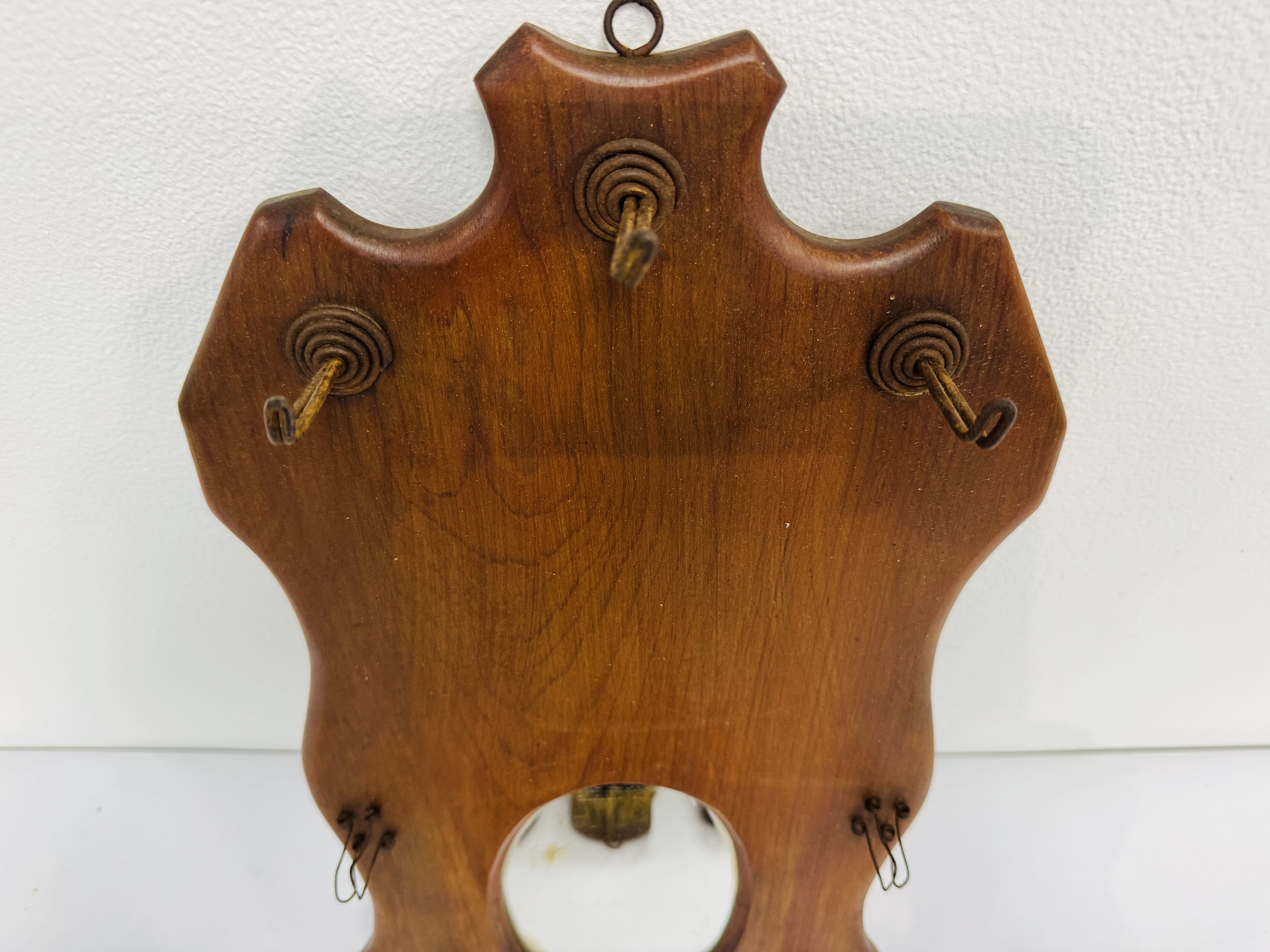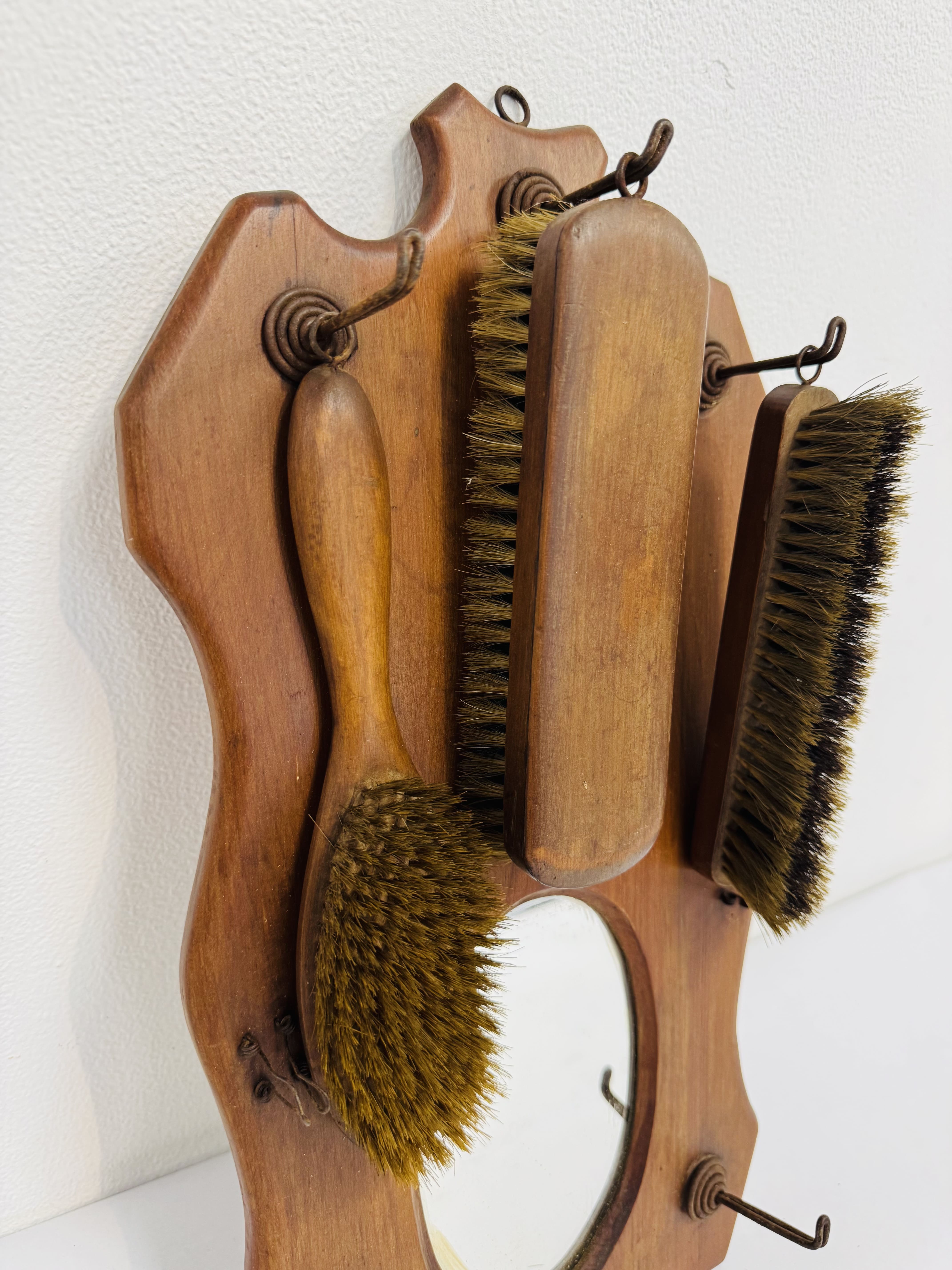 Lote #060 – Soporte de pared en madera con espejo oval y tres cepillos de madera con cerdas naturales – 23x45cm