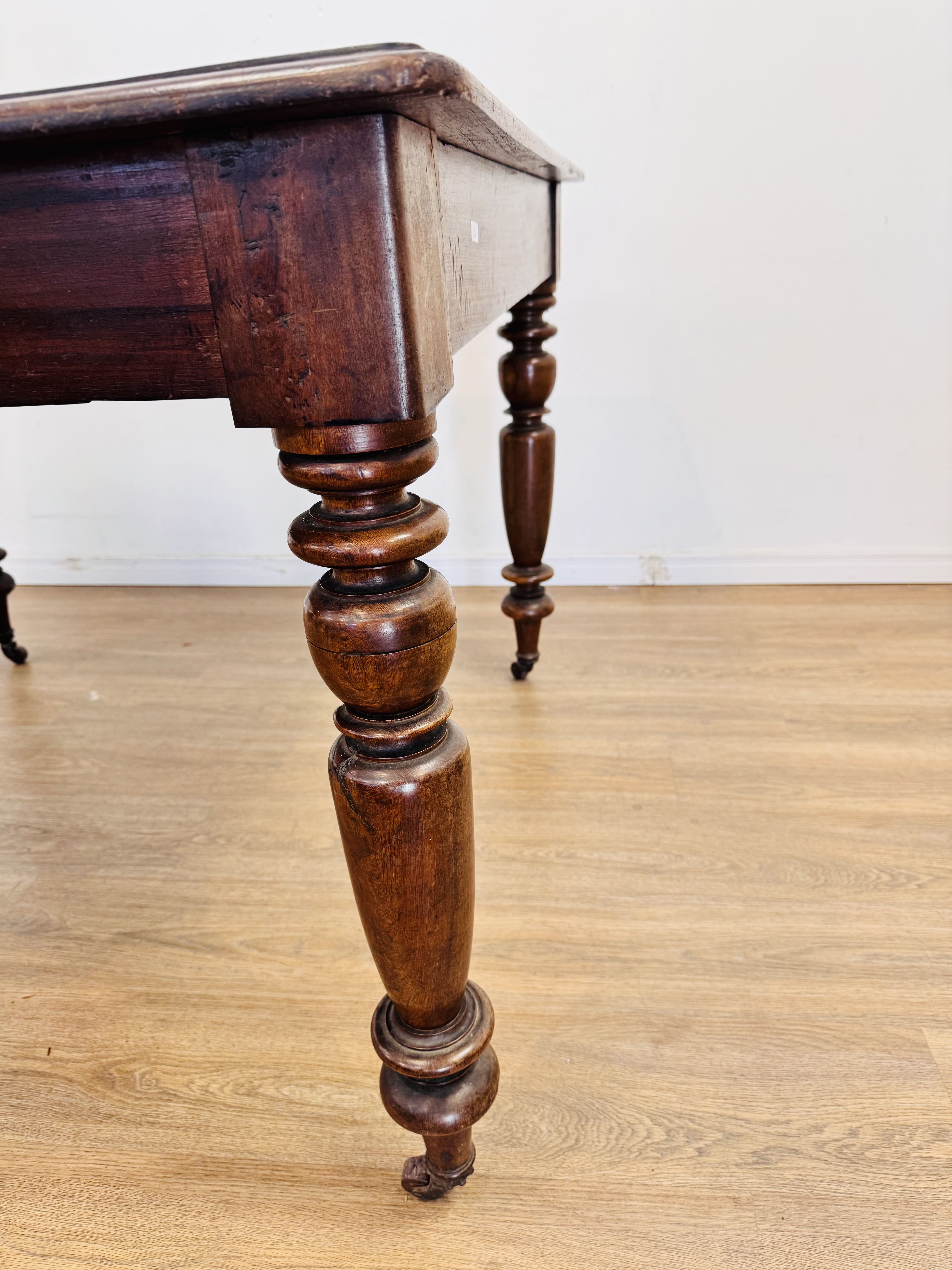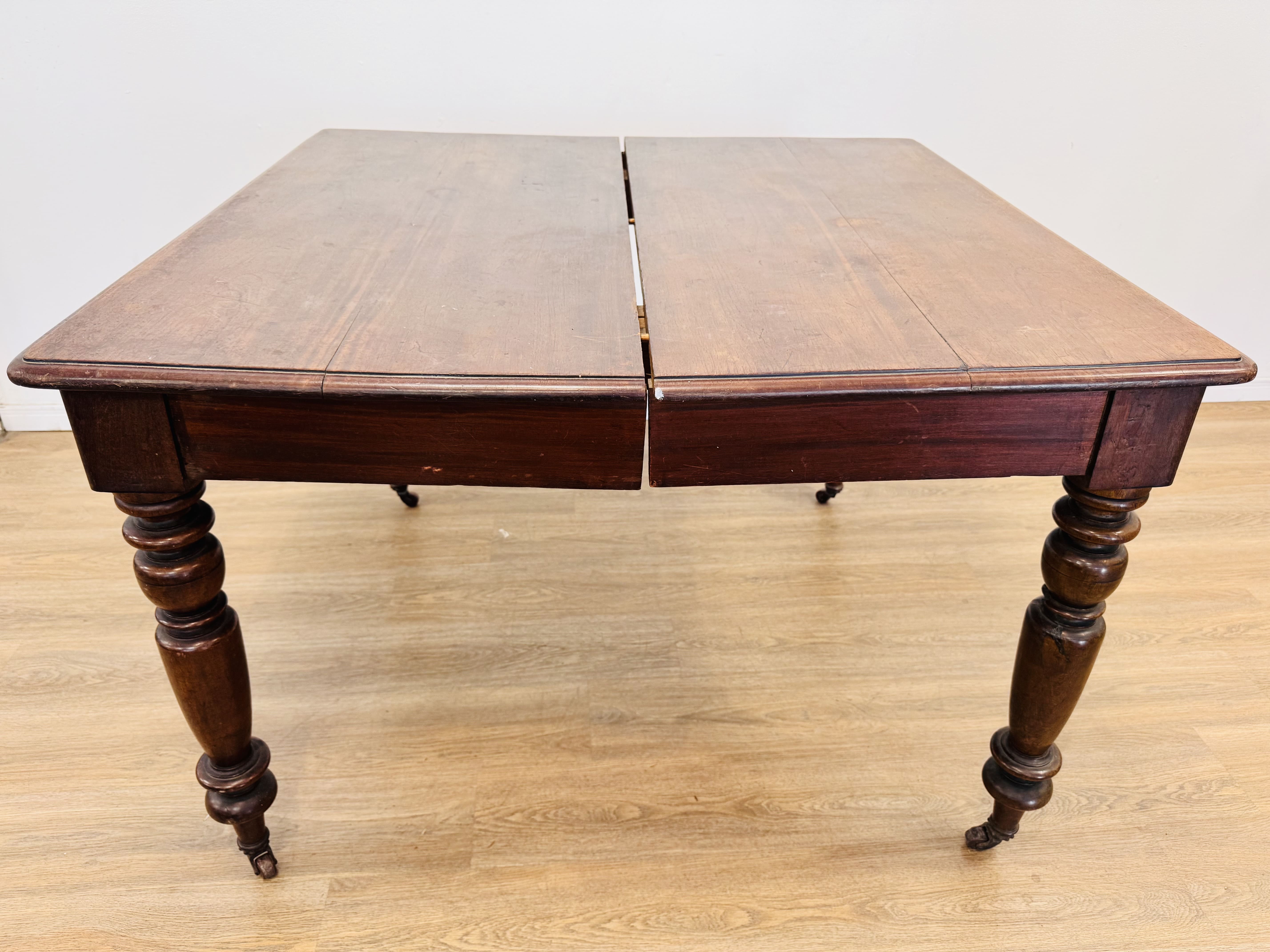 Lote #084 – Mesa de comedor de cedro con dos alargues, patas torneadas con ruedas de bronce – necesita ajustes para correr bien y colocar los alargues – 164x112x80cm más 46cm de cada alargue