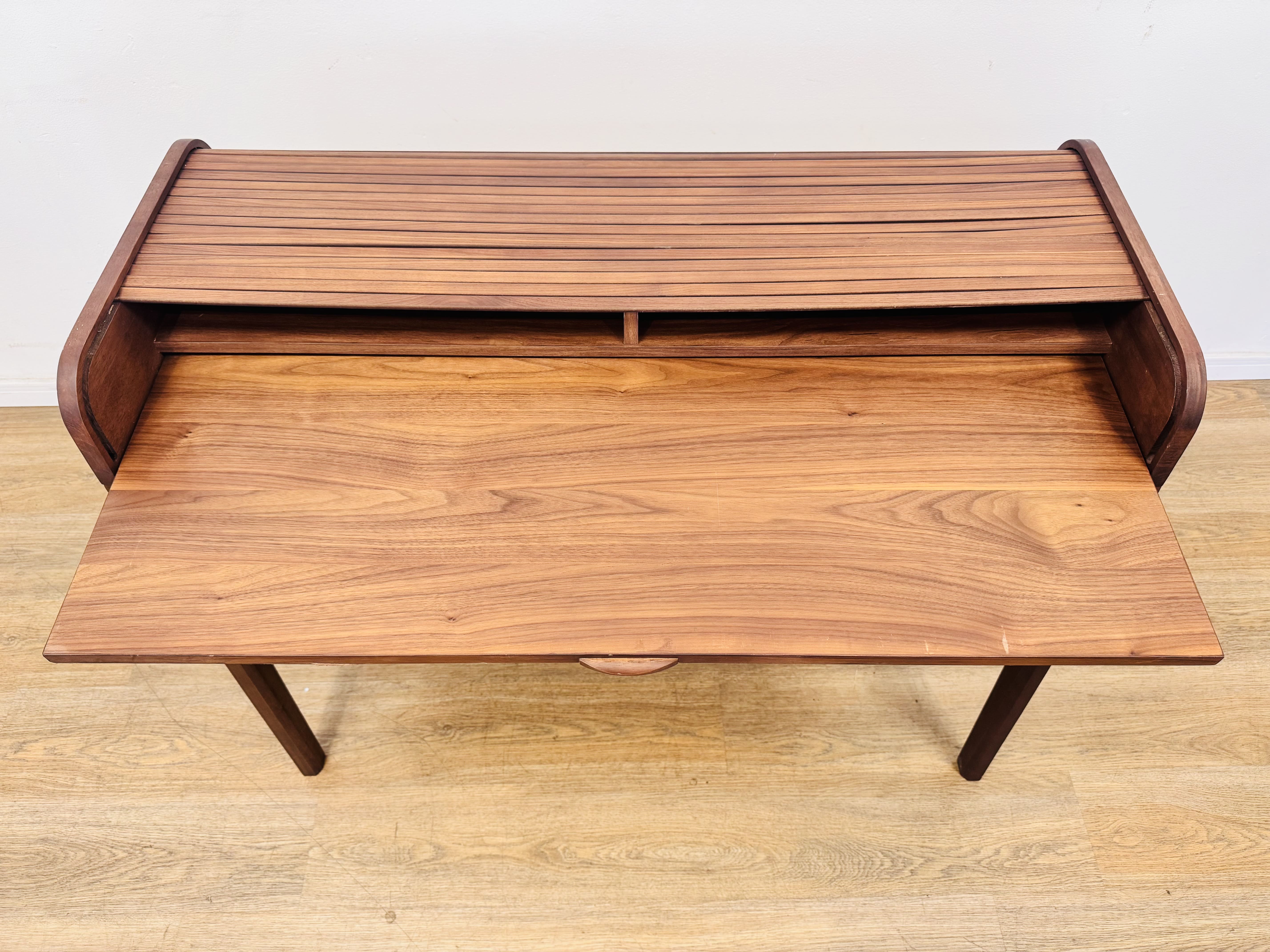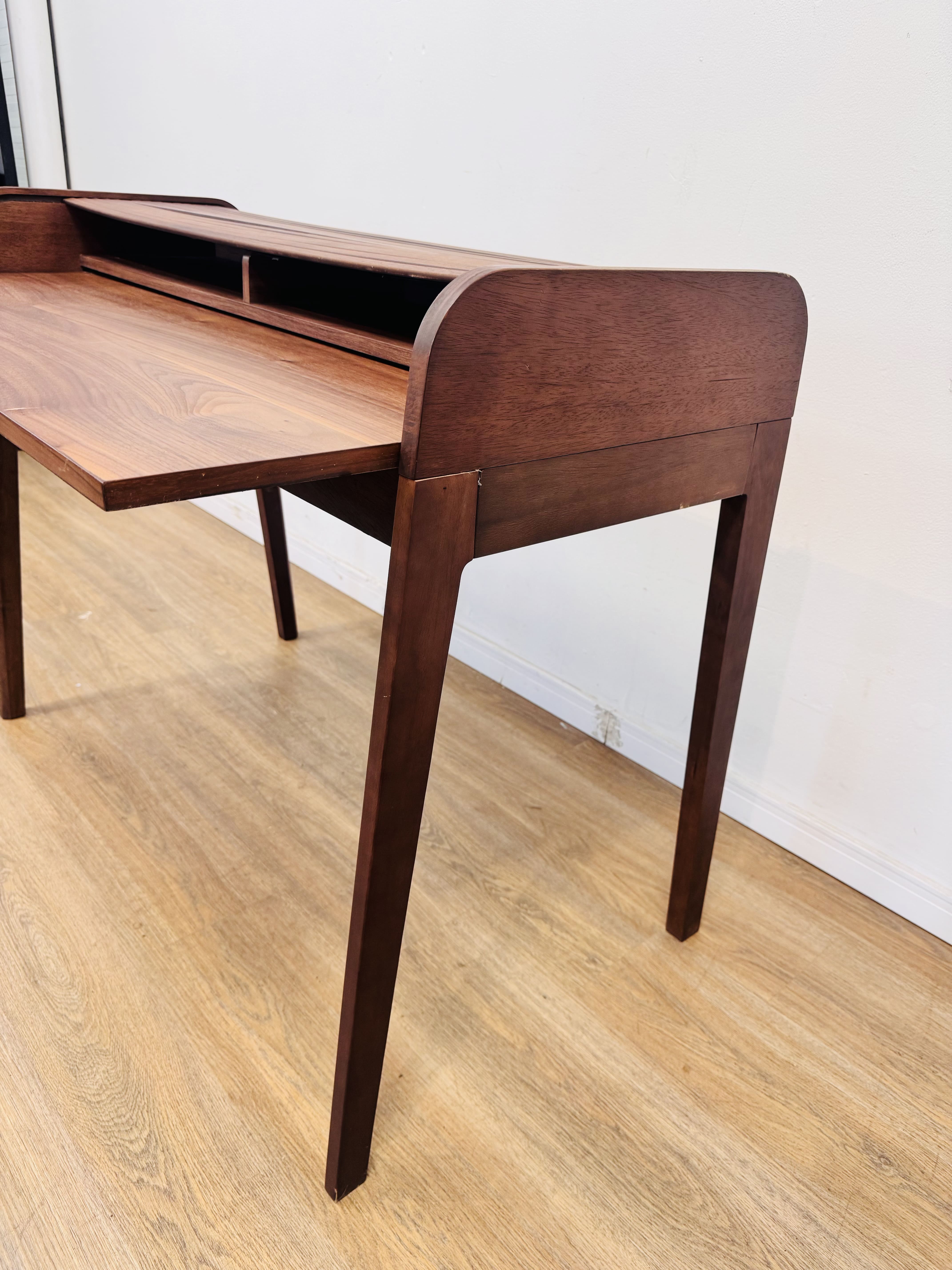 Lote #158 – Escritorio de roble moderno con cortina – 110x67x85cm, SIN USO, de importante mueblería – Tiene reparación en una pata y necesita cambio de un riel para que la cortina corra sin trancarse