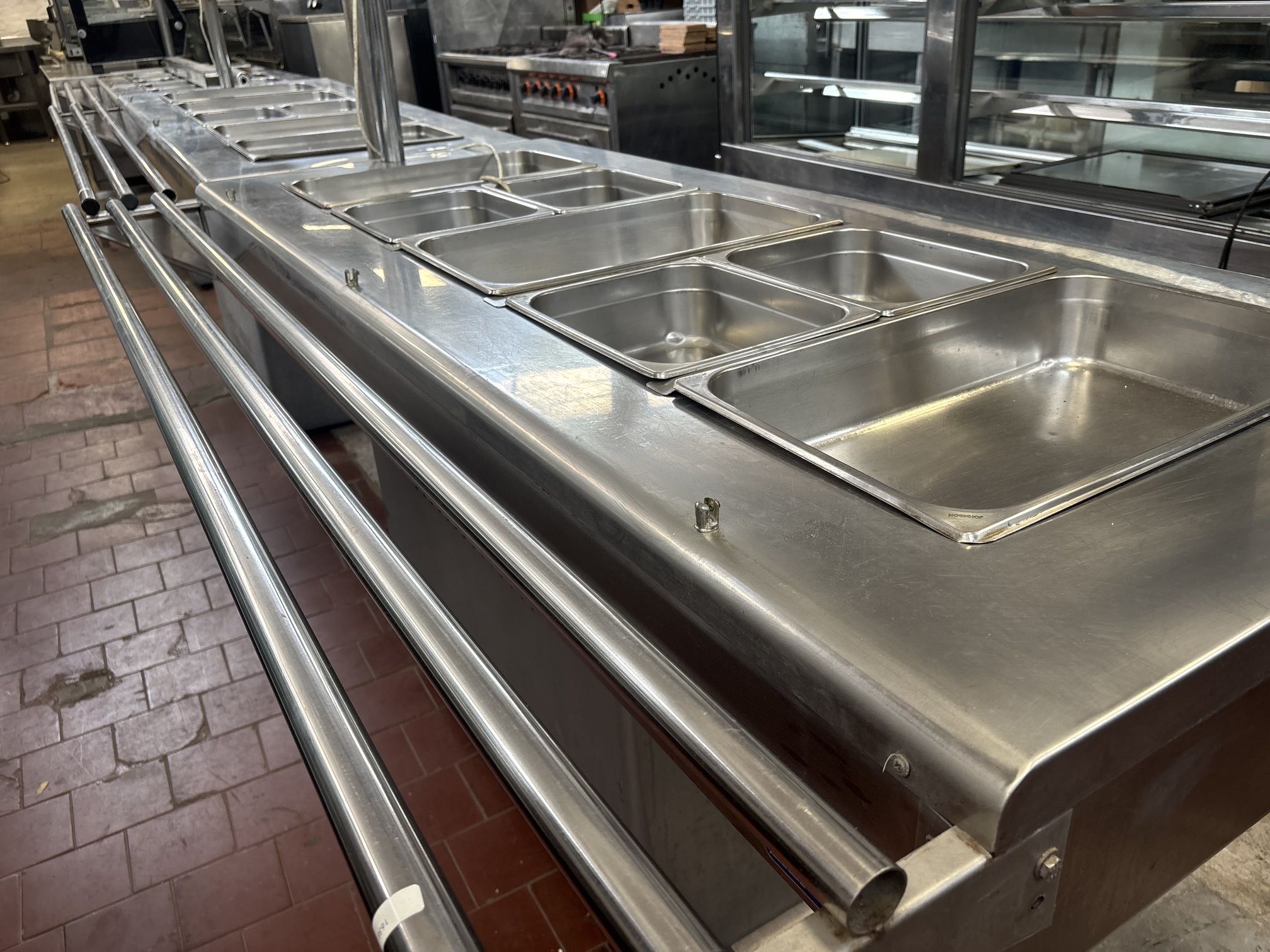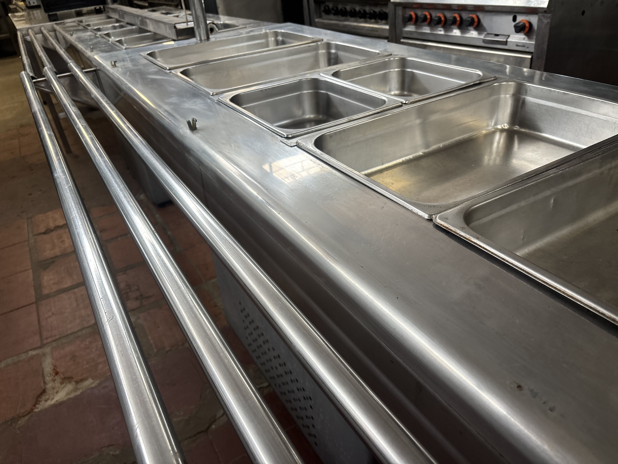 Lote #340 – Conjunto de tres bufeteras en Ac/Inox de alto calibre ¨Morelli¨ – 2 de fríos (salad bar, con equipo de frío) y 1 de calientes (bufetera) vidrios bombé y todas sus cubas correspondientes en Ac/inox